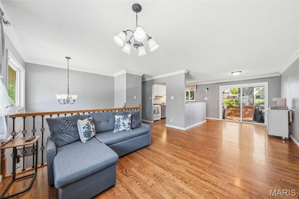 Maryland Heights 3 bedroom plus sleeping area home has 1500 sq ft of finished living space. Open floor plan features gleaming hardwoods, neutral paint, crown molding and designer fixtures. Family room with lots of natural light opens to the dining room with sliding door to the deck. Dining room is open to the kitchen where you will find white cabinets, gas oven, tile floors, & serving bar. MF 3 bedrooms feature hardwood floors and custom closet organizers. Designer MF bathroom has subway tile & warm wood vanity. LL Rec. & game room has tile floors and tons of great natural light. LL sleeping area provides the option for a primary suite or in-law quarters and has custom closet built-ins. Updated 2nd full bath in the LL. Large laundry room provides lots of room for storage or a workshop plus access to the backyard. Large flat fenced yard complete with deck, fire pit, storage shed, mature trees, nice landscaping is the perfect space to relax. Quick access to highways, Creve Coeur Park, and the Maryland Heights Community Center.