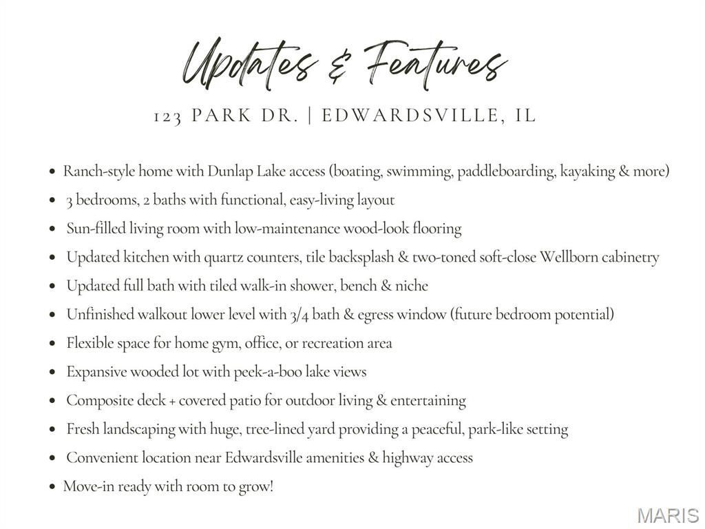 Discover the ease of ranch-style living with Dunlap Lake access in this inviting 3-bedroom, 2-bath home. Designed for comfort and everyday functionality, the sun-filled living room features low-maintenance wood-look flooring that flows seamlessly into the dining area. The dining space opens to a beautifully updated kitchen with two-toned, soft-close Wellborn custom cabinetry, quartz countertops, and a coordinating tile backsplash. Down the hall, you'll find a spacious primary bedroom with ample closet space, along with two additional bedrooms and a beautifully updated full bath featuring a tiled walk-in shower with built-in bench and niche. The unfinished walkout lower level offers incredible potential with space for a future bedroom (egress window in place), home gym, office and recreation area, plus an existing 3/4 bath. Set on an expansive, tree-lined lot with peek-a-boo lake views, the backyard is ideal for relaxing or entertaining. Enjoy outdoor living hosting dinner al fresco on the composite deck set against a dream wooded backdrop or spend the afternoon relaxing on the covered patio below, surrounded by fresh landscaping and a park-like setting. Located just minutes from Edwardsville amenities with easy highway access, this home also includes Dunlap Lake privileges for boating, kayaking, and summer fun. Move in now and expand later. The dock is on E. Lake at common area E2 Floating dock built in 2024 and owned with the house. No Extra Lake dues.