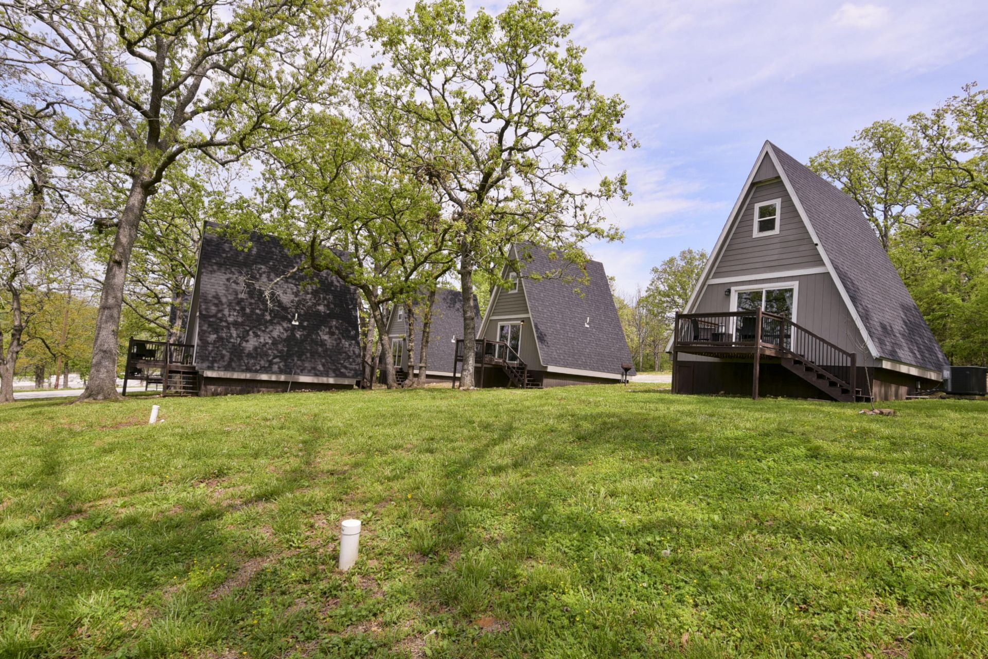 Ozark Paradise! 5 A-Frame on appx 2.80 acres of Ozark Beauty and Trees with lots of parking area, newly refurbished and decorated to the T. Short Term Rental opportunity close to Table Rock Lake, Baxter Marina and Black Oak Amphitheater. This opportunity is unlike many others because it really caters to Family or Group Vacations and outings to ''Getaway From it All''. The Cabins are similar yet unique, sleeping six, nice decks, nicely appointted, and brings people back to the quiet, easy lifestyle and enjoying nature and quality time.. Private bedroom on main level with private bath, kitchen, dining and living room. the loft area features 2 beds. Great outdoor space private and common area. As an Investor, the units had great reviews with ARBNB, but you can self manage or use any management company. The County may require a new STR Permit. The Location is excellent. The property requires not outlay of capital to get started. There is opportunity for expansion, up to 3 more cabins with utility service and land allocation. Shared Well and Septic.