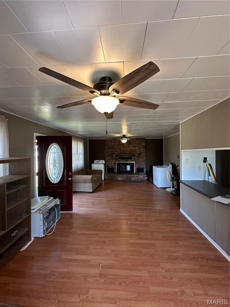 This 3-bedroom, 1-bathroom property sits prominently on a double corner lot and boasts a spacious 60 x 24 garage with an integrated office. The interior living space begins with a combined living room and dining room, featuring a wood-burning fireplace with blower units. The kitchen is positioned conveniently off the dining area. A central hallway provides access to the three bedrooms, the single bathroom, and the laundry facilities housing the water heater. The dining area opens out onto a deck that overlooks a yard with partial fencing. At the rear of the property stands the expansive 60 x 24 garage. New siding was installed in 2025. The metal roof is less than 10 year old. And a new A/C Unit was installed in 2025.